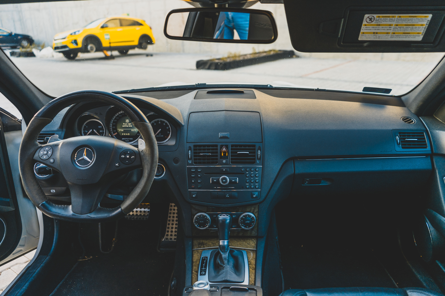 A belteret már a hagyományos C osztályból ismerhetjük, ám itt szinte minden jóval felszerelték. Motorosan működik mindkét első ülés. A 82 kilós súlyomhoz pont passzol a méretü, de nagyobb emberek számára már meglehetősen szűkös lehet annak ellenére, hogy az ülést lehet tágítani vagy szűkíteni az oldalpárnák segítségével. A beltér tele van apró figyelmes részletekkel, ilyen a modell specifikus kormány, melynek alját lecsapták, hogy jól magunkra tudjuk húzni, ahogy egy sportautóban illik. Ilyen az óracsoport is, azon belül is az AMG al-menü. Itt olyan finomságok vannak elrejtve mint a stopper óra, mely képes köridő mérésre. Nyomon tudjuk követni az olajnyomást és az olajhőfokot is.