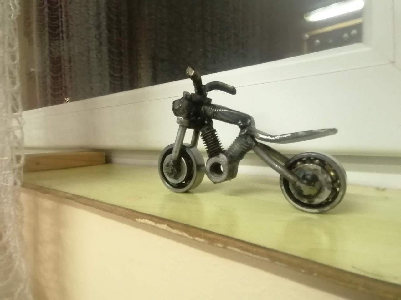 A lámpa kapupánt csavar fejéből készült, és ezt a motorblokk esetében is használtam több helyen. A csapágyakat zsír spray-vel fújtam be, hogy legyen valami kenésük. Az egész kapott egy kis lakkozást a végén, hogy ne rozsdásodjanak. A legtöbbet rendszeresen látom, mert többeknél azóta is kint van díszként és nem látok rajtuk korróziót.